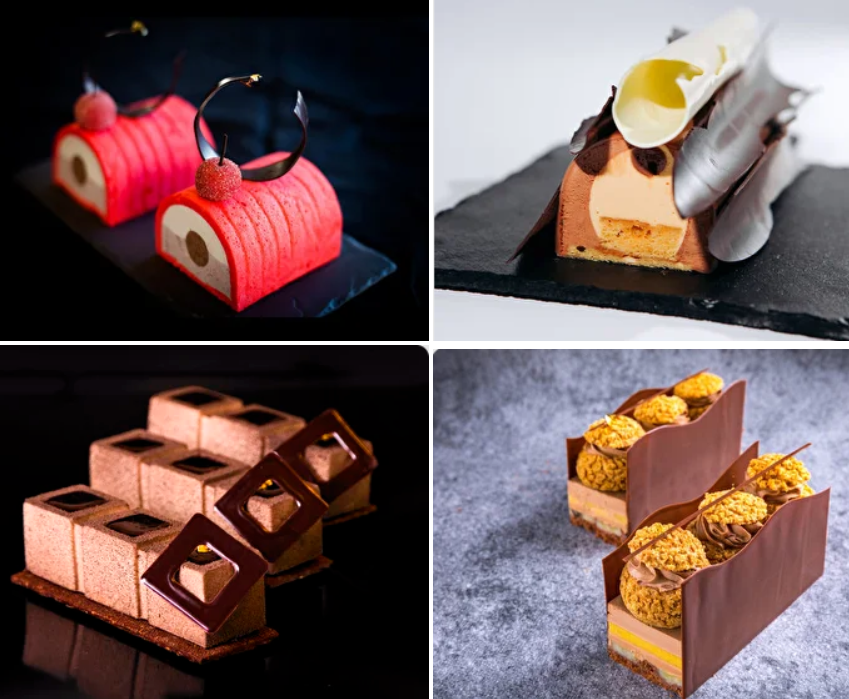 Состав: йогуртовый бисквит с маракуйей; йогуртовый мусс с ванилью; конфи с малиной, маракуйей и розой; декор: пластичный шоколад Callebaut и шоколадные элементы Callebaut
