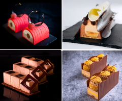 Состав: брауни с 4 видами шоколада; мусс с белым шоколадом Zephyr 34% Cacao Barry и ванилью; мусс с горьким шоколадом Cacao Barry Extra-Bitter 'Guayaquil' 64% и сливочным ликером; мусс с карамелизированным белым шоколадом Zephyr Caramel 35% Cacao Barry; глазурь 'Джиандуйя' и молочным шоколадом Chocolate Alunga 41%.