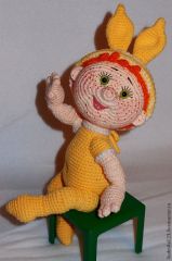 Ручки, ножки и голова крепятся в процессе вязания с помощью пластиковых суставов (шплинтов), поэтому подвижны. Глаза винтовые, реснички, бровки, веснушки, ногти прорисованы.