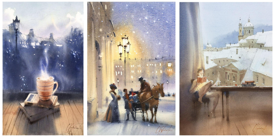 Цель: Напишем зимний Петербург, но не парадный, торжественный, грандиозный - а камерный, домашний, уютный. Вдохновимся «Другими берегами» Набокова. Изучим фотографии горожан XIX века, чтобы нарисовать нарядную даму в зимней одежде. Городской свет, хлопья снега, извозчик с каретой и пустая улица - добро пожаловать в сказочный акварельный Петербург! Продолжительность урока 2 часа 36 минут.