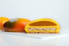 бисквит фонда с кокосом, начинка с экзотическими фруктами, манговый мусс