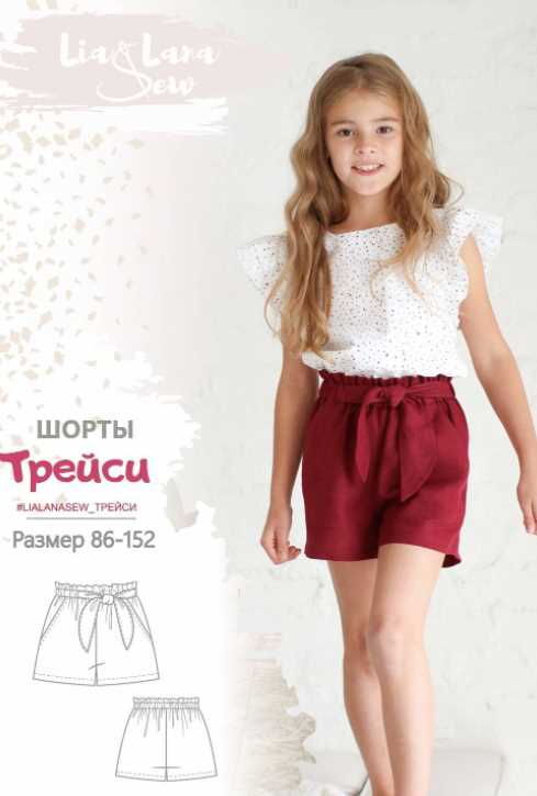 Шорты летние короткие, свободного кроя. На передней части шорт боковые карманы «в швах» с отрезным бочком, линия входа в карман наклонная. Верхний срез шорт обработан притачным поясом, на передней части которого притачивается завязка. Ширина шорт по линии талии регулируется резинкой, вставленной в кулису с имитацией рюши по верху.