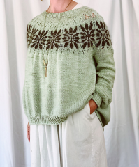Ingalls–это удобный и свободный пуловер с круглой кокеткой, который вяжется сверху вниз, с жаккардовым и ажурным узором, при желании нижний край спинки можно связать более длинным