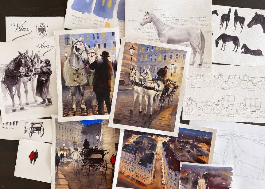 Вы научитесь работать со светом и теплохолодностью цветов. Узнаете, как при помощи простых приемов можно вписать лошадей и конные экипажи в городской пейзаж. С легкостью напишете сложный сюжет вечерней панорамы города.
