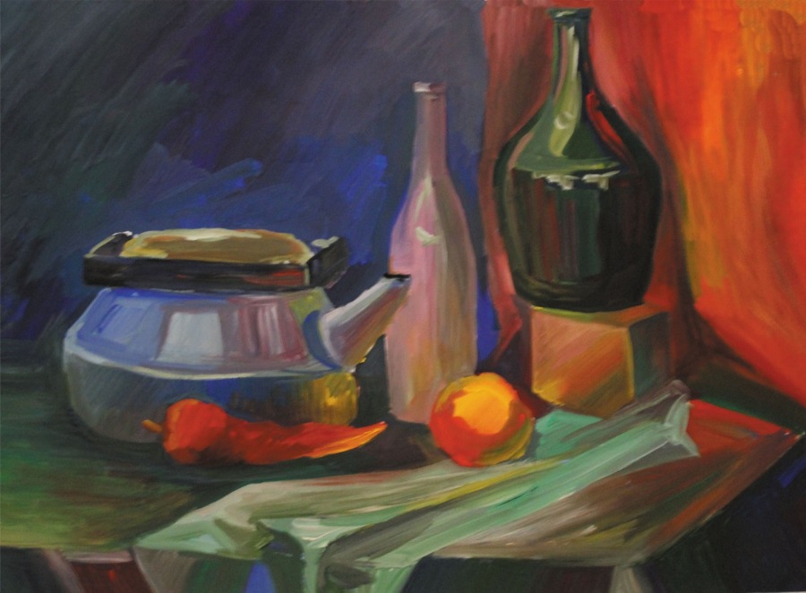 • изображать натюрморты из предметов быта с драпировкой, в теплой и холодной цветовой гамме, а также в монохромной гамме.