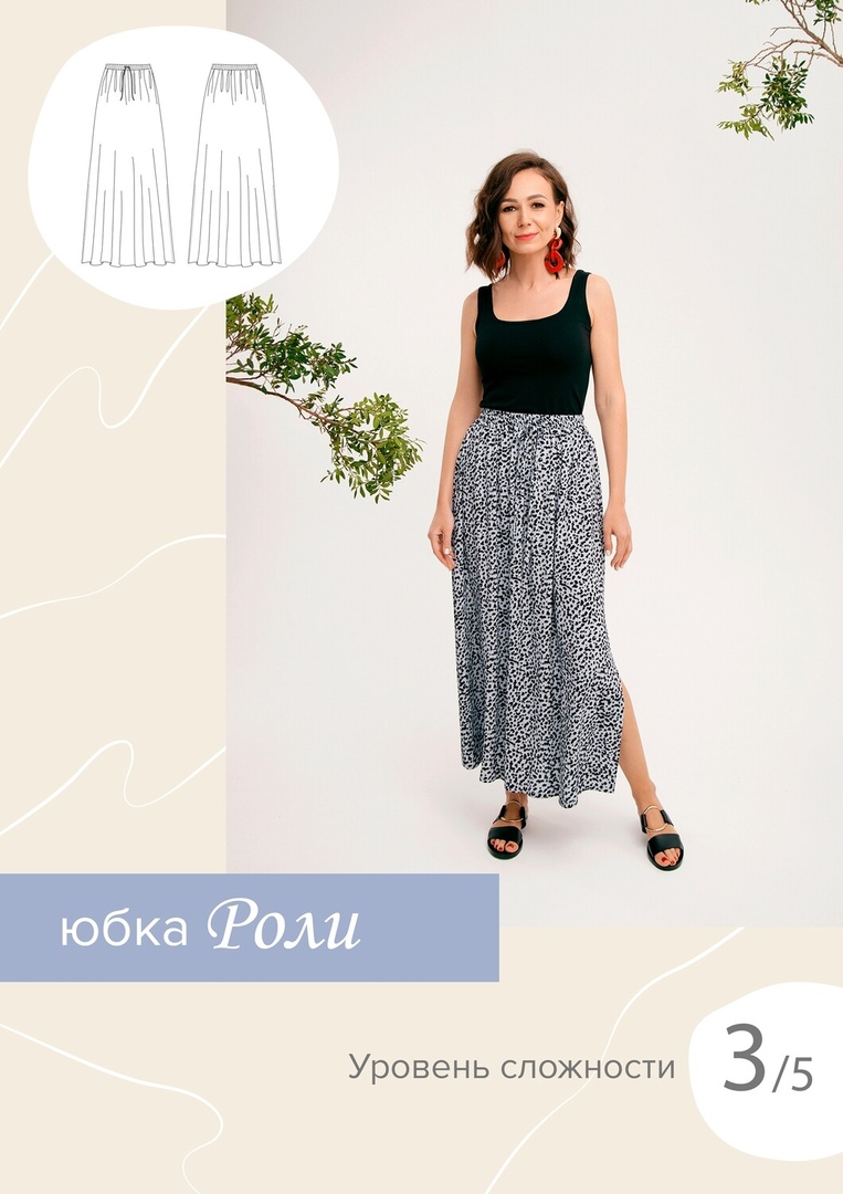 Юбка трапециевидного силуэта с разрезами в боковых швах. Пояс юбки на резинке, в кулиску на поясе вставлена завязка из основной ткани. Длина юбки ниже середины икры.