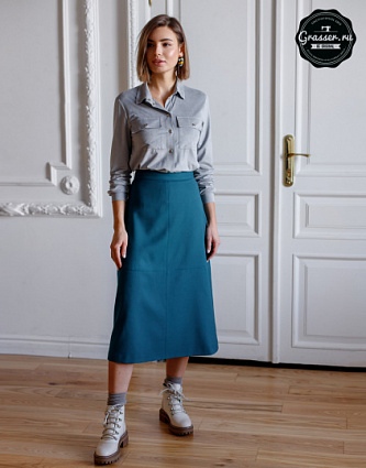 Юбка трапециевидного силуэта, длиной ниже колена, на подкладке. Переднее полотнище со средним швом. На заднем полотнище талиевые вытачки и средний шов, в котором обработана застежка на потайную тесьму «молния». Юбка с горизонтальным членением на уровне середины бедра. Верхний срез юбки обработан притачным поясом с застежкой на одну пришивную кнопку.