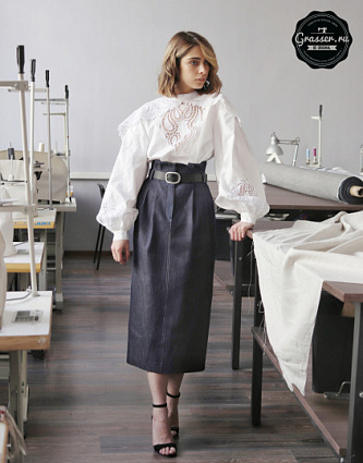 Юбка прямого силуэта, слегка зауженная книзу, с цельнокроеным поясом (от линии талии до верха пояса 7 см), длиной ниже колена. Форма «тюльпан» достигнута за счет односторонних складок на переднем и заднем полотнищах. Переднее полотнище с застежкой на тесьму «молния» в среднем шве, с карманами с отрезной боковой частью. Заднее полотнище со шлицей в среднем шве. На естественной линии талии расположены шлевки (для пояса шириной 4 см).